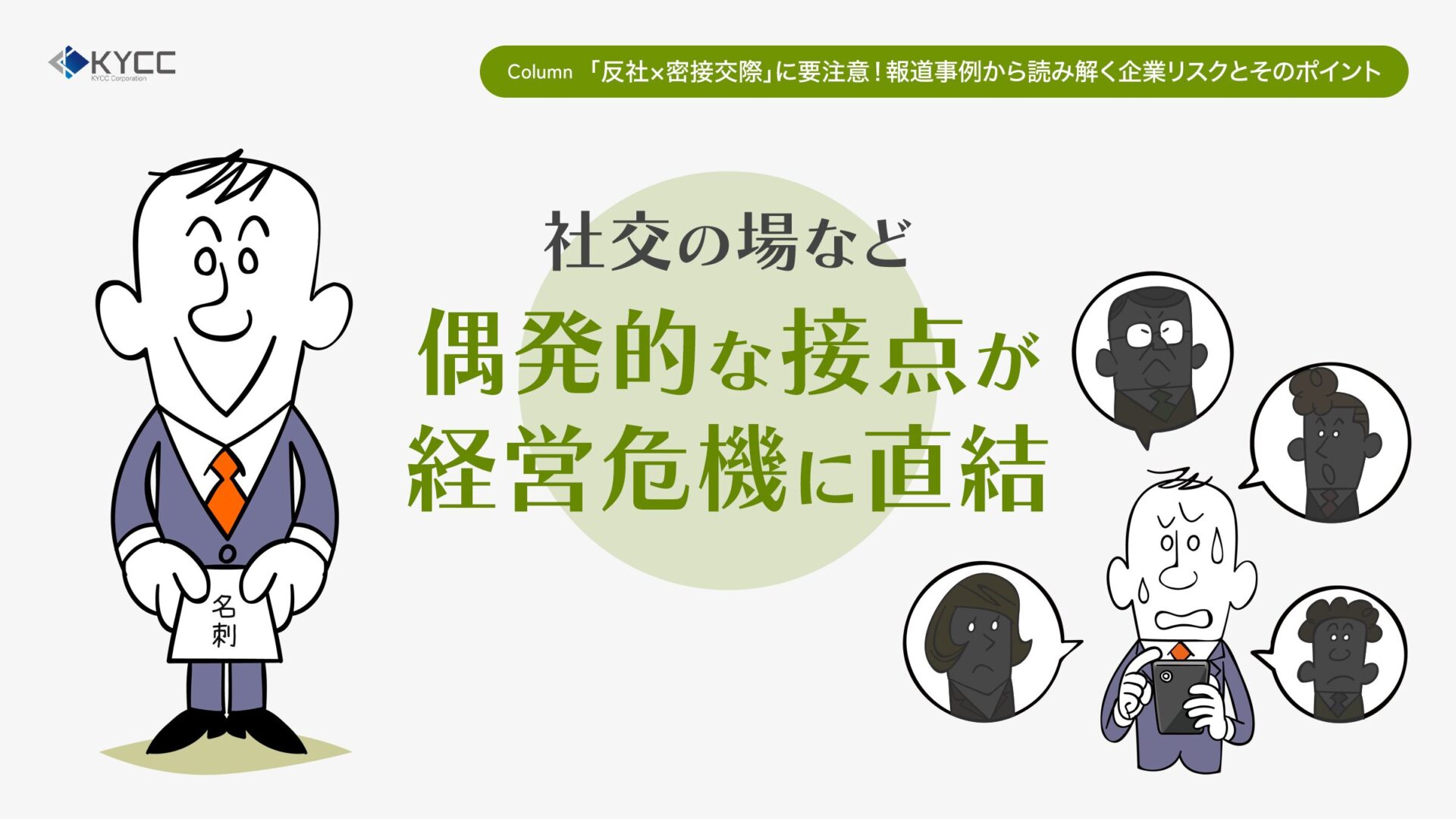 交流会など社交の場での一度の接点に過ぎなくても「密接交際」と評価されてしまえば社会的信用を急速に失い、企業の事業継続が困難となるリスクが現実化しているといえます。実際には反社との取引や契約がないにもかかわらず、起こり得る事態です。