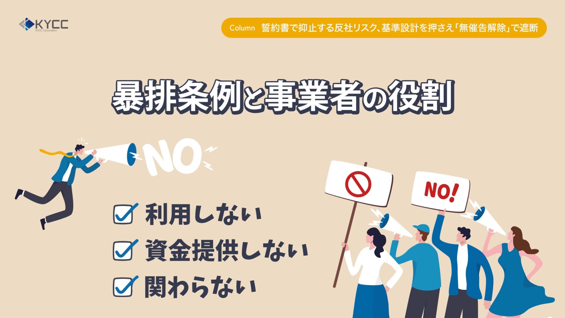 都道府県の暴力団排除条例は、住民・事業者に対し「反社を利用しない・資金提供しない・関わらない」ことを基本原則として周知しています。事業者向けの周知資料で求めているのは、契約前確認、契約書への特約整備、違反時の段階的措置(勧告・公表・命令・罰則)を含む体系を示し、入り口確認と出口解消の両輪です。