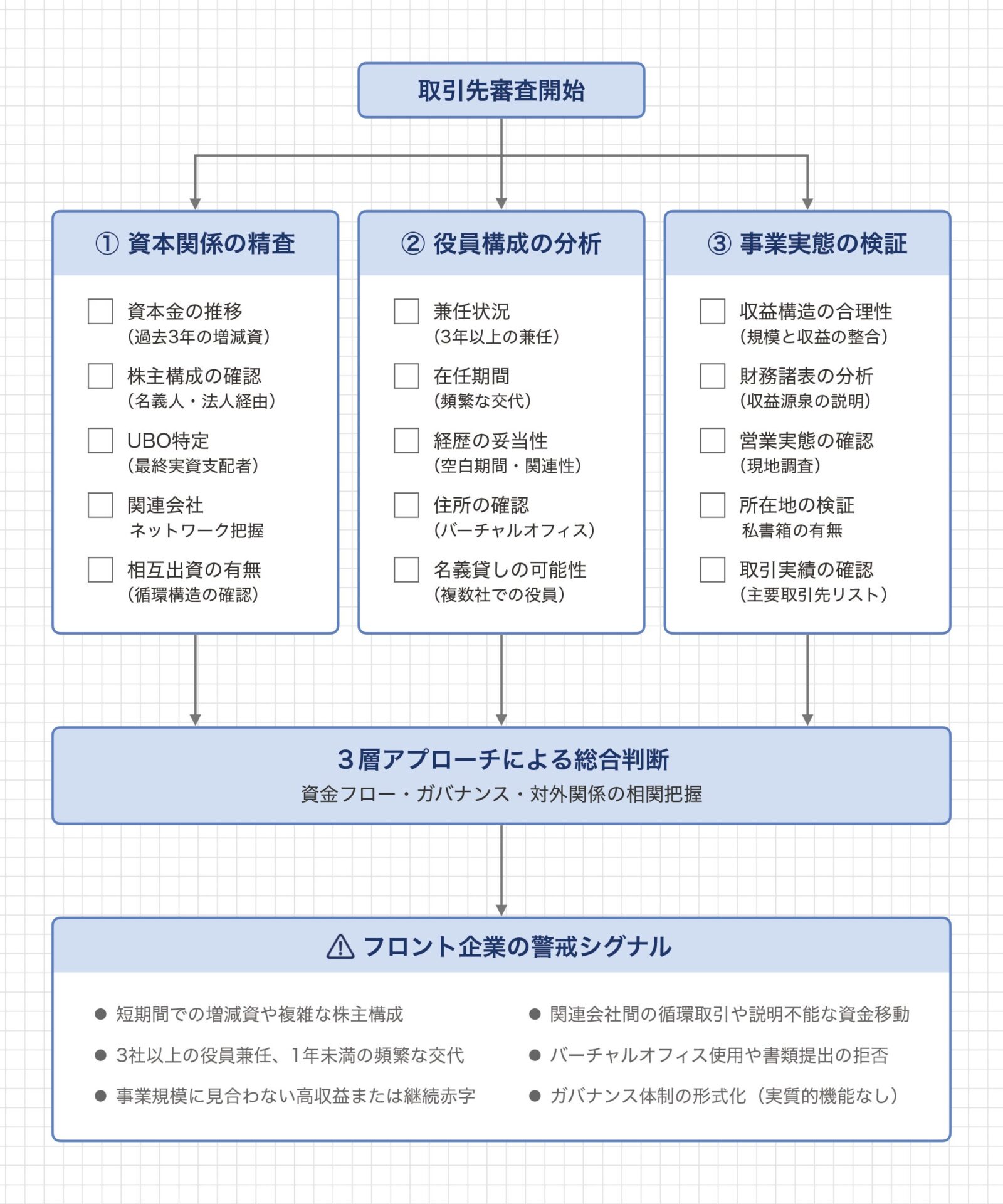 反社チェックにおいてフロント企業を識別するために必要なのは、資本関係、役員構成、事業実態の三つの視点から総合的に判断することです。