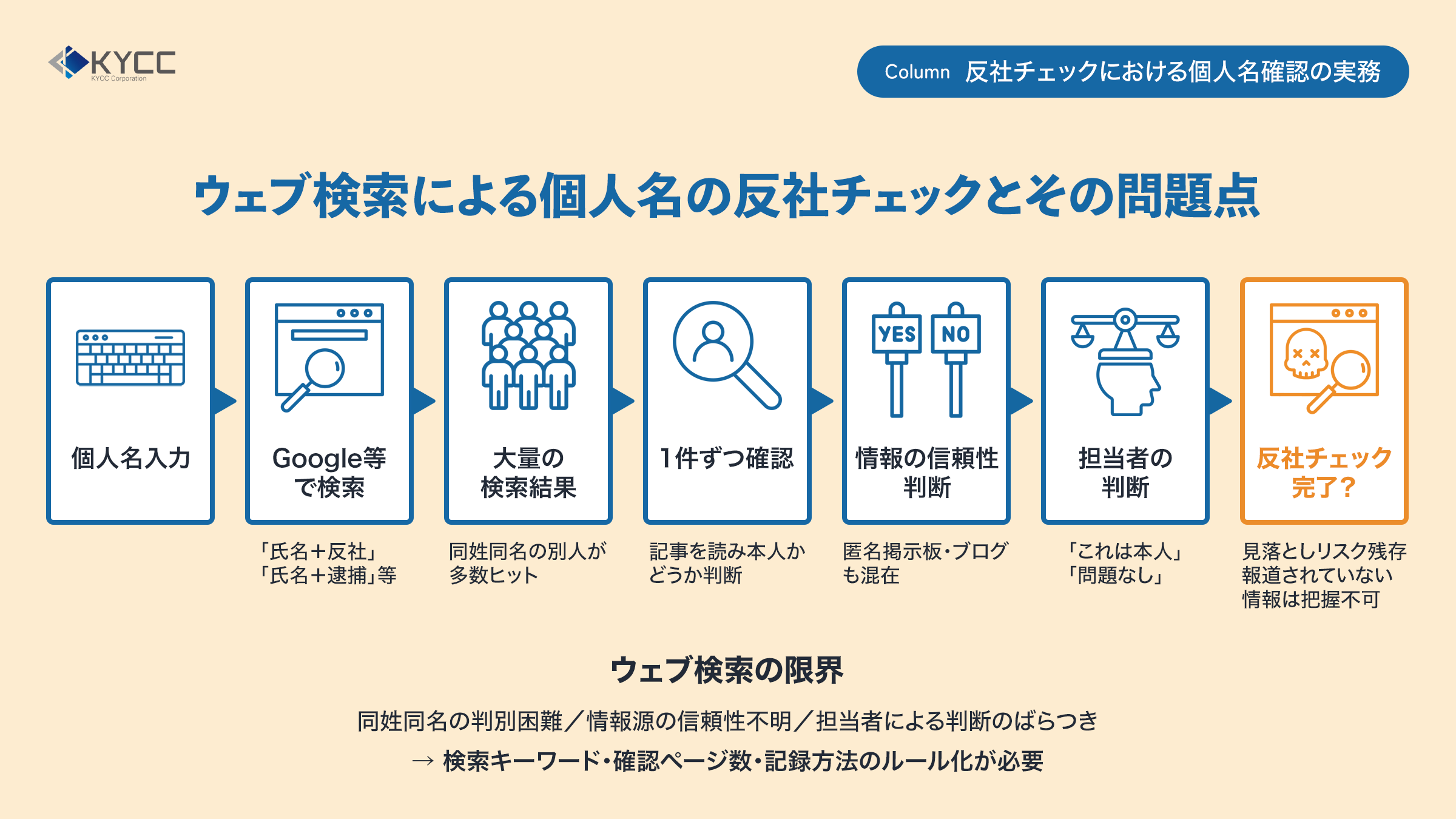このため、ウェブ検索を調査に使う場合は、検索キーワードのパターンという方法、確認するページ数という方法、結果をどのように記録するかという反社チェックの方法をあらかじめルール化しておくことが重要です。それでもなお、ウェブ検索だけではカバーしきれない部分があることは、個人名の反社チェックの限界として認識しておく必要があります。