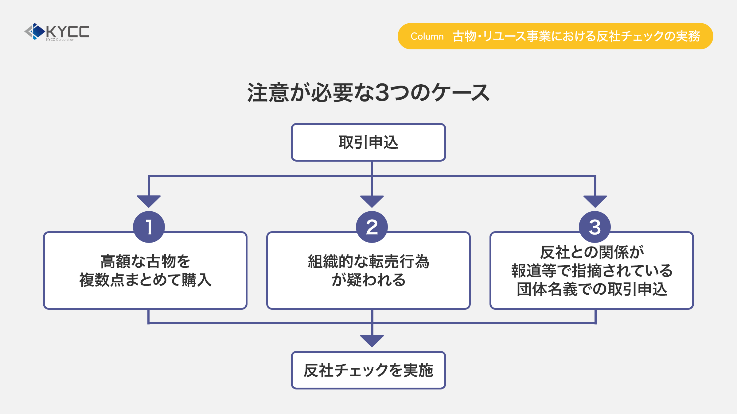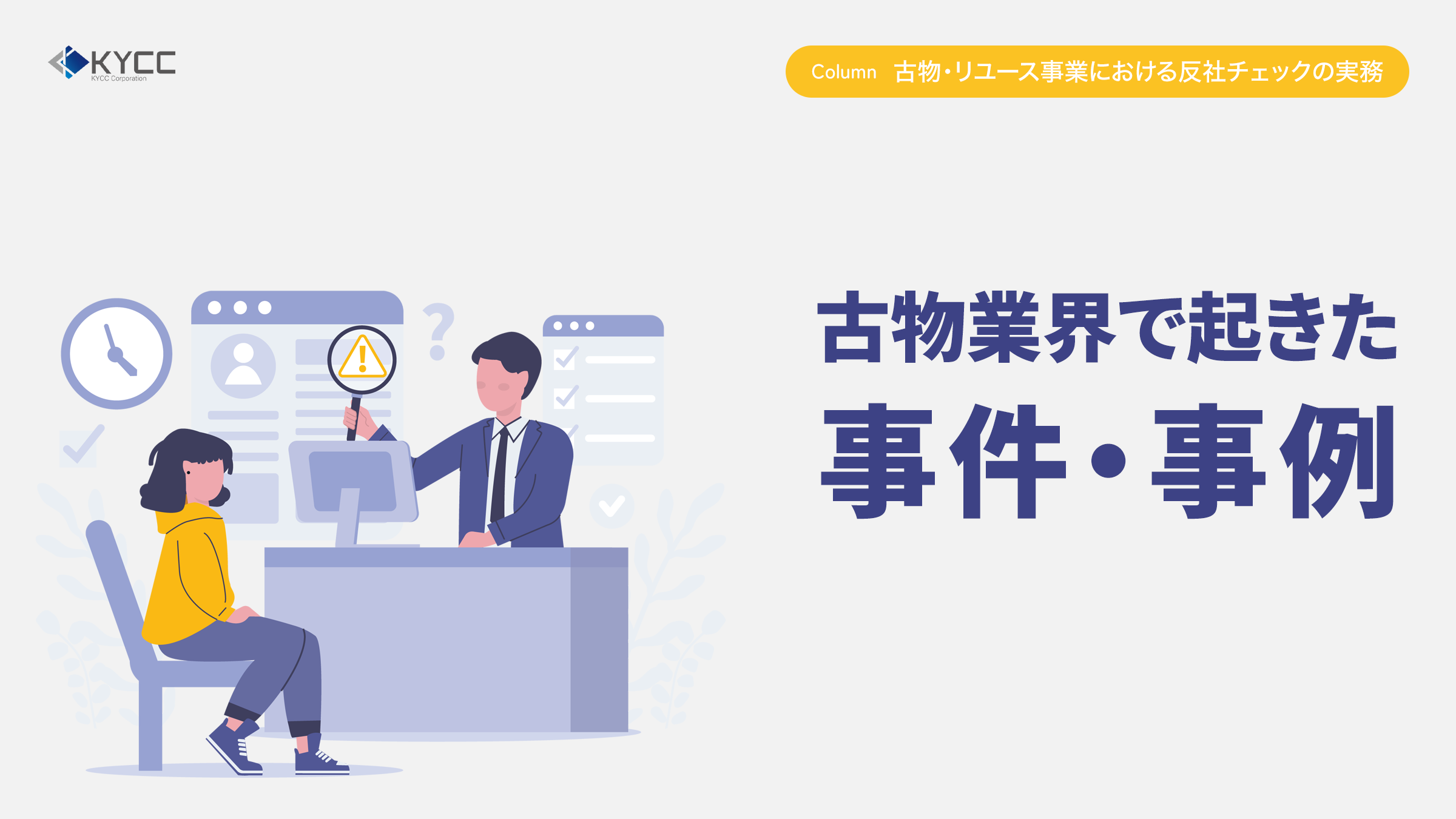 ネット経由の古物取引では、対面取引と比べて相手の実態が見えにくいため、より慎重な反社チェックが求められます。