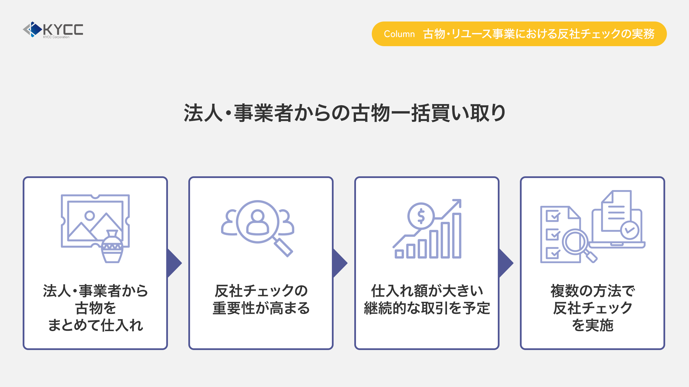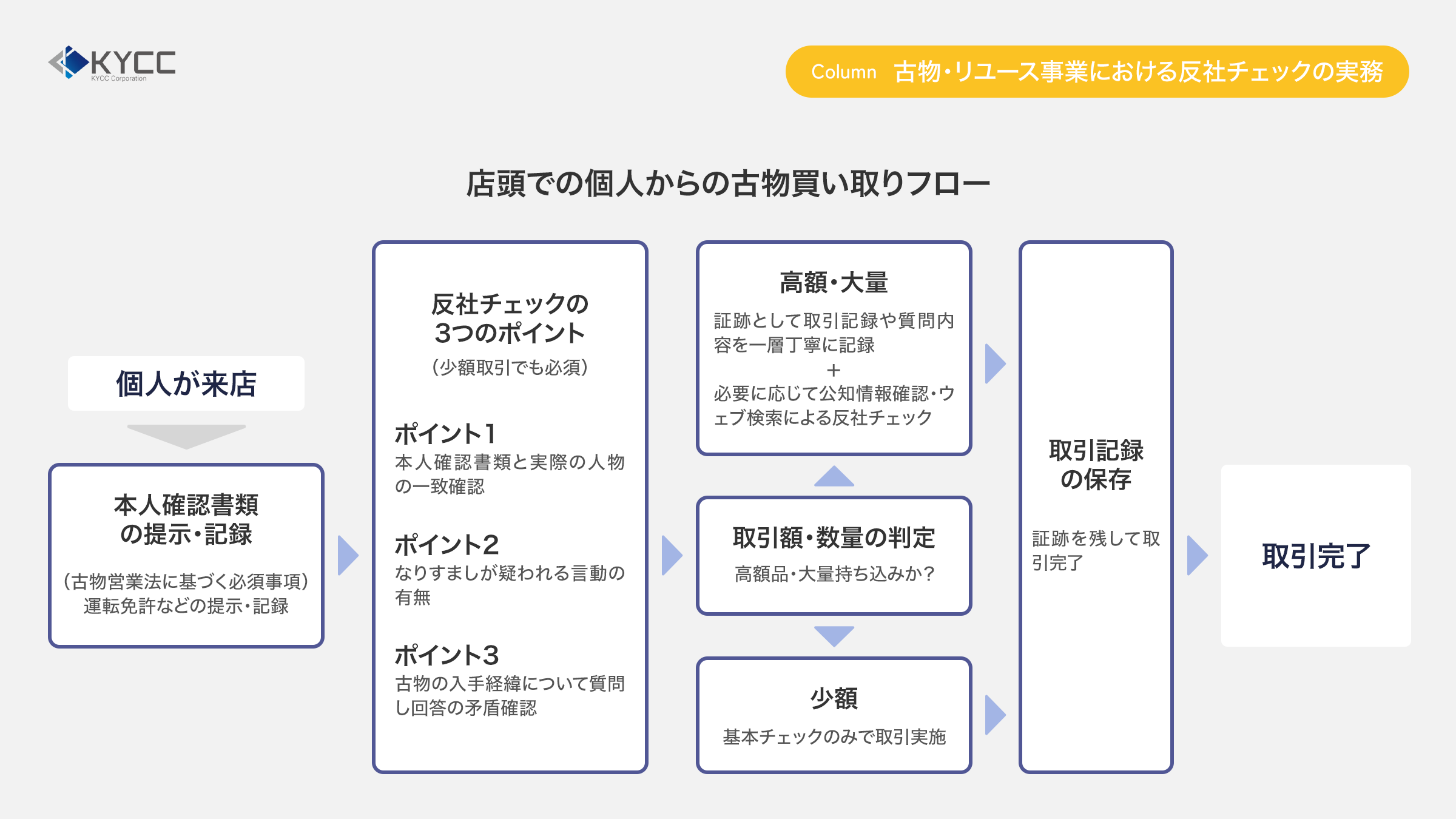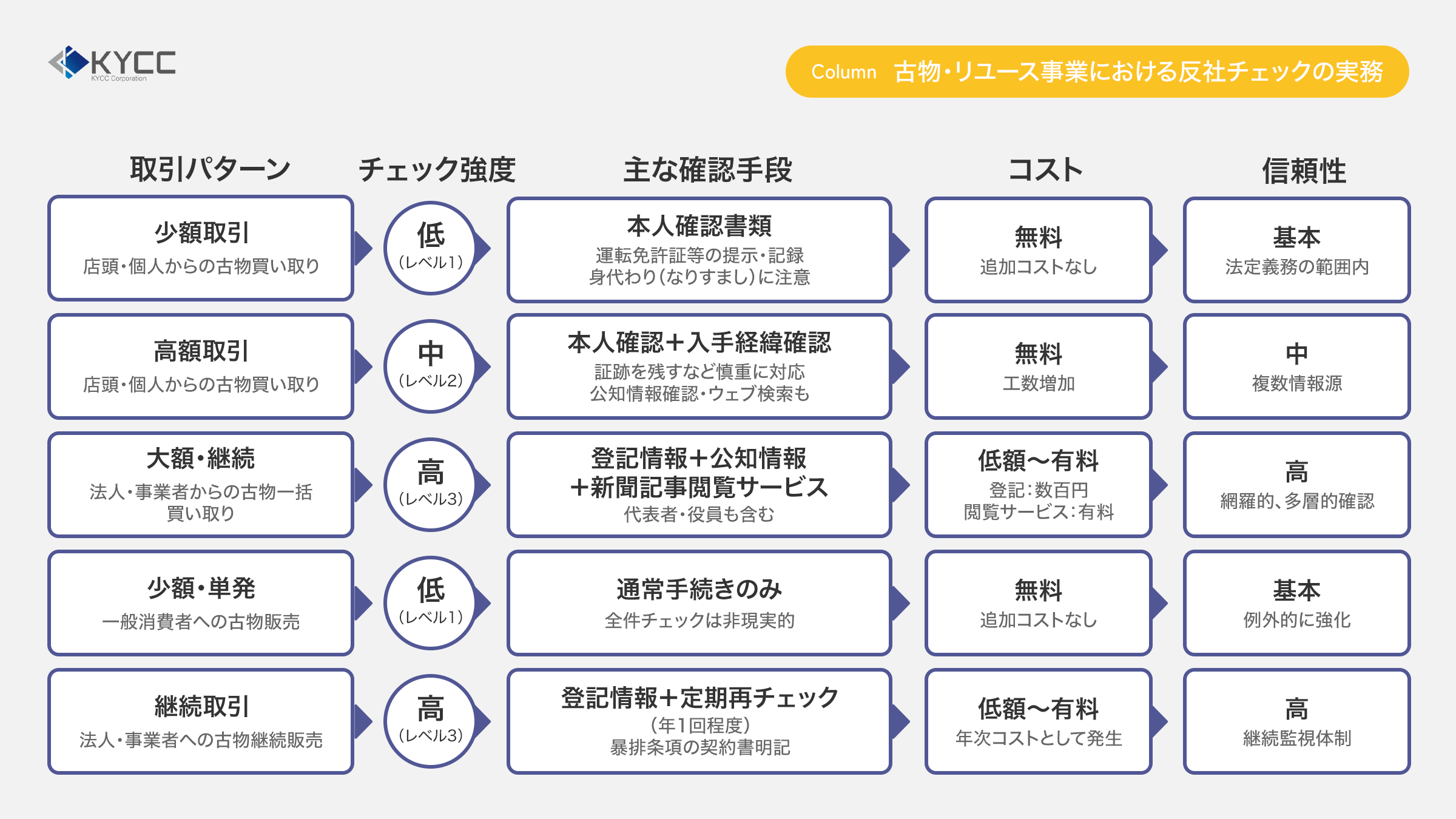 古物事業における反社チェックは、取引の規模や継続性に応じて強度を調整します。