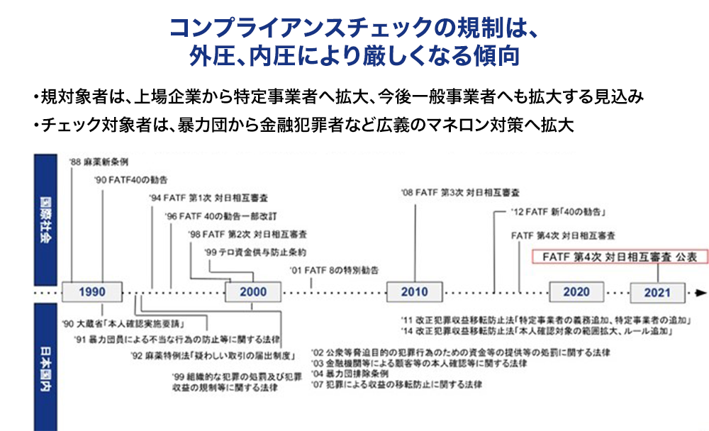 日本におけるコンプライアンスチェックの規制は、外圧や内圧によって厳しくなる傾向があります。
