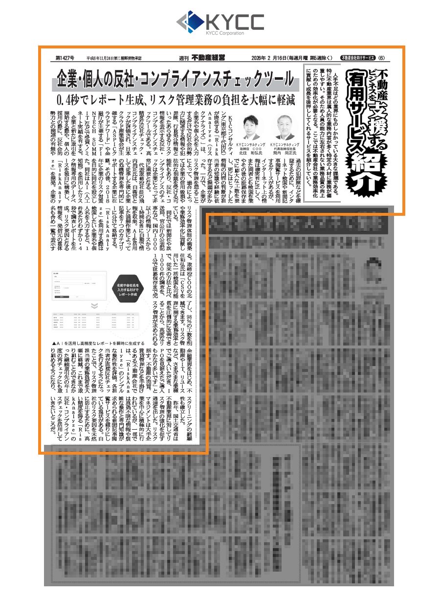 2026.02.25 お知らせ メディア掲載 2026年2月16日 週刊不動産経営に掲載されました。 週刊不動産経営 2026年2月16日に、KYCコンサルティング の記事が掲載されました。 記事タイトル:「企業・個人の反社・コンプライアンスチェックツール」 前の記事へ 一覧へ戻る