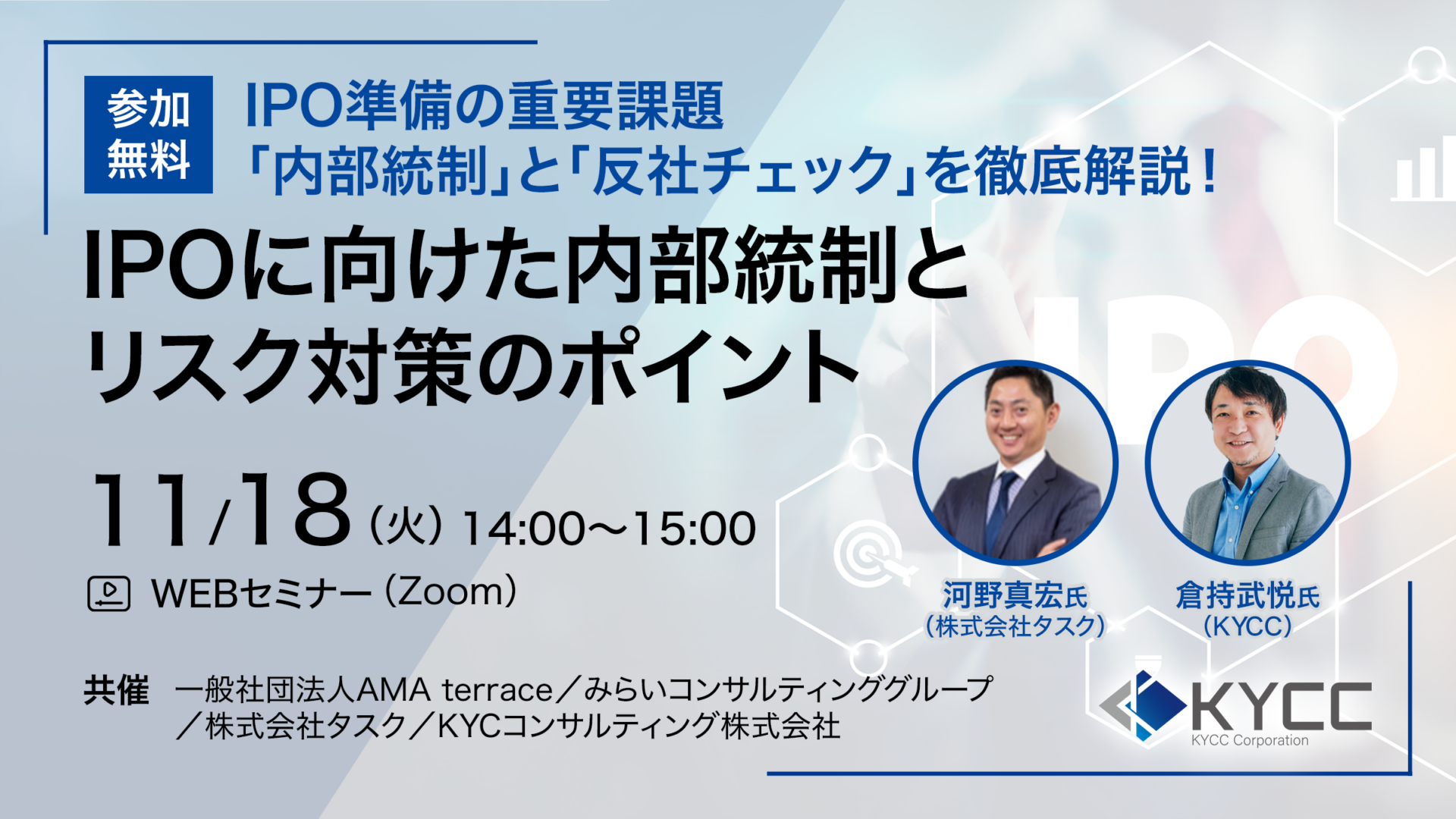 | 共催 | KYCコンサルティング株式会社/株式会社タスク/一般社団法人AMA terrace/みらいコンサルティンググループ |