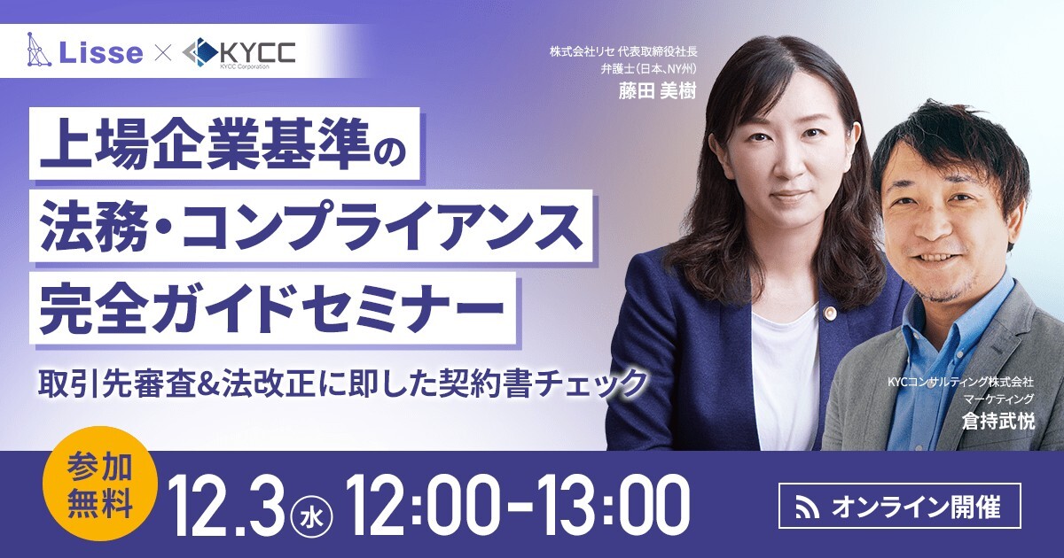 本セミナーでは、上場企業基準の法務・コンプライアンス体制構築に必要な、取引先審査と最新法改正対応の2つの重要テーマを実践的に解説します。反社チェックからフリーランス新法・改正下請法への対応まで、上場審査で求められる実務ノウハウをお届けします。是非奮ってご参加ください。