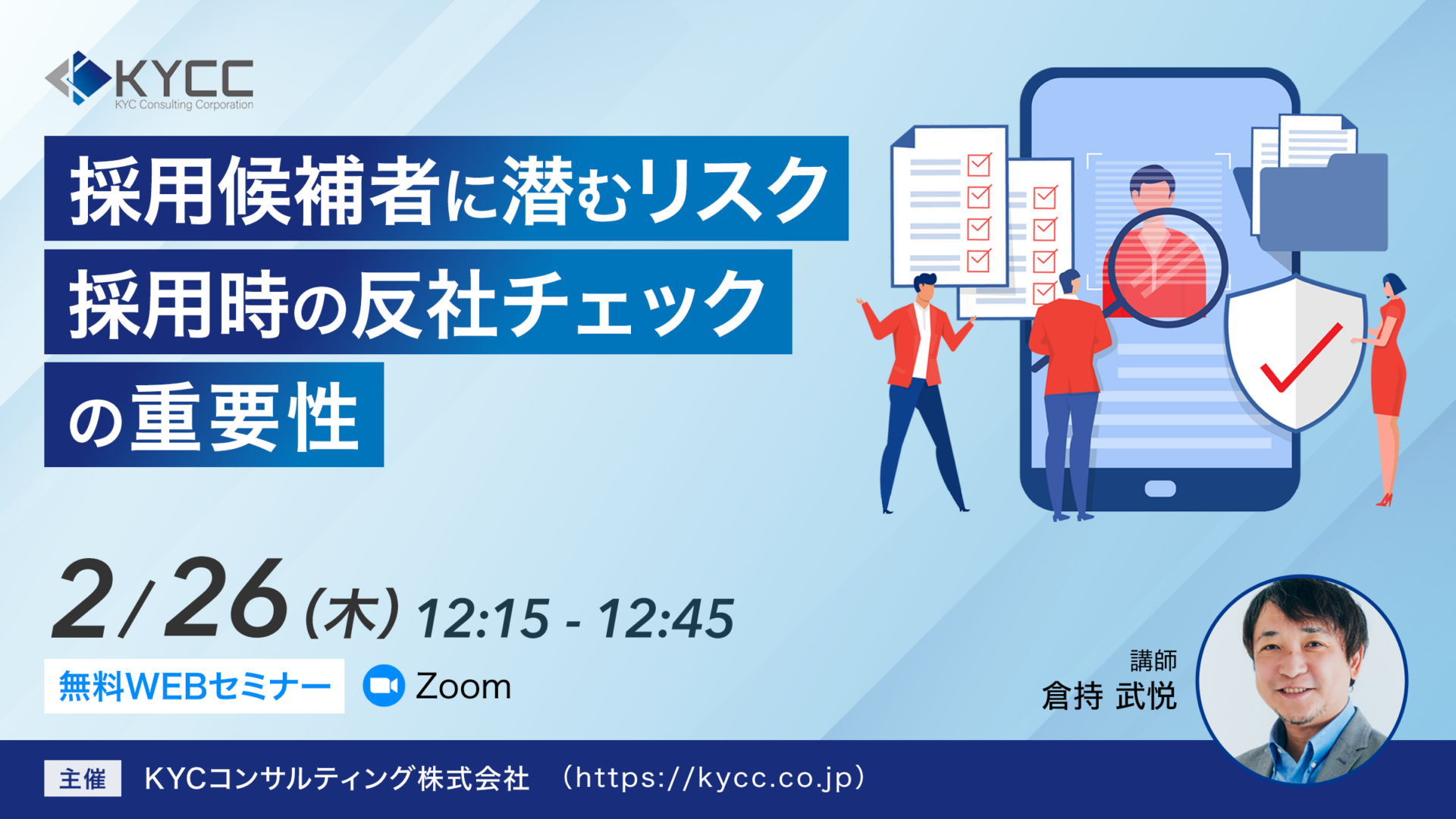 2026年2月26日(木)12:15よりオンラインセミナー「リファレンスチェックと同時に行うべき、採用候補者の反社チェックの重要性」を開催いたします。